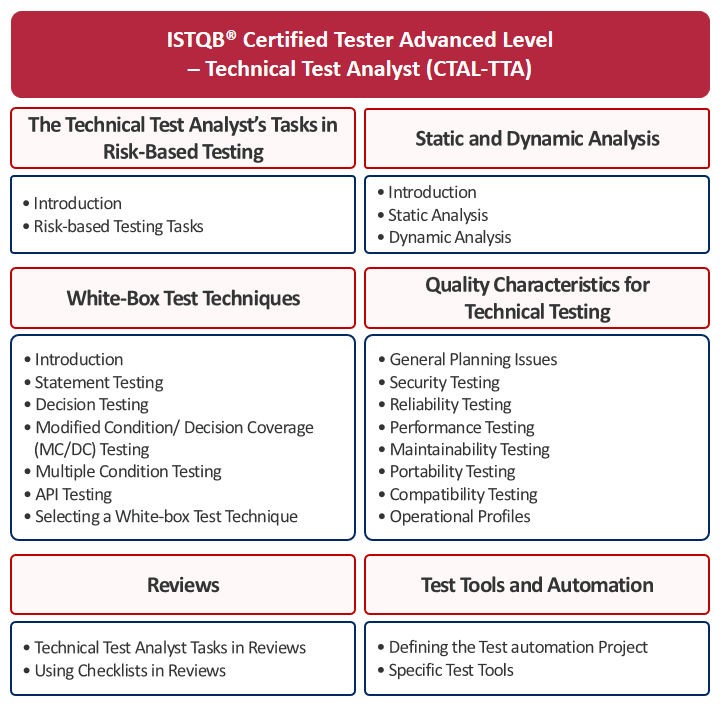 Exam in English for native English speakers (120 minutes). Exams by KSTQB For over 20 years, KSTQB has been a leading provider of certification examinations. Our exams are meticulously developed to ensure the highest quality, guaranteeing that certified professionals have a comprehensive understanding of the relevant syllabus. Overview The ISTQB® Advanced Level Technical Test Analyst (CTAL-TTA) provides a thorough introduction to the technical testing skills which are fundamental in many organizations today. These skills include risk-based testing, white box testing, static and dynamic analysis, non-functional testing, and test automation. Audience The Advanced Level Technical Test Analyst certification is suitable for anyone who is involved in testing as well as anyone interested in further developing their software testing knowledge. This includes people performing activities such as test analysis, test consulting, and software development. To gain this certification, candidates must hold the Certified Tester Foundation Level certificate. Once you pass the exam, KSTQB will email you to request evidence of your Foundation Level certification. Visit ISTQB.org for additional information and the Technical Test Analyst syllabus.